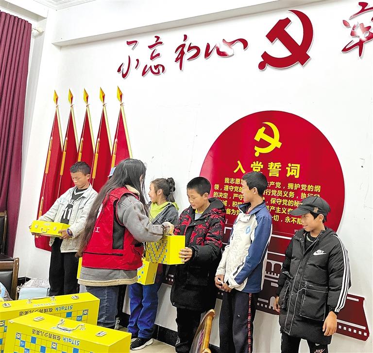 圖為工作人員向事實(shí)無人撫養(yǎng)兒童發(fā)放圖書。記者 胡文 王珊 張猛 攝