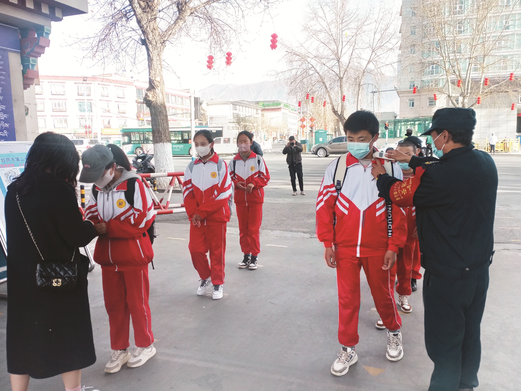 圖為市二中學(xué)生入校前接受體溫檢測。拉薩融媒記者 齊永昌攝