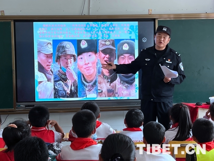 中國西藏網(wǎng)訊 “同學(xué)們,大家知道照片上這位英雄是誰嗎?”伴隨著民警周升展的提問聲,孩子們紛紛舉起手回答出了這位英雄——祁團(tuán)長?!澳銈冋媛斆?,今天叔叔給大家講一講新時代衛(wèi)國戍邊英雄祁發(fā)寶團(tuán)長的故事……”