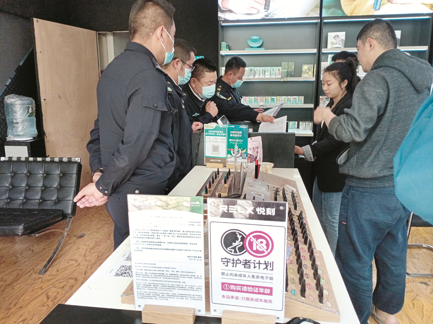 4月25日上午,市公安局和市煙草專賣局等四部門工作人員在柳梧新區(qū)聯(lián)合開展了電子煙銷售網(wǎng)點(diǎn)檢查。每到一個(gè)電子煙銷售網(wǎng)點(diǎn),執(zhí)法人員會(huì)詳細(xì)查看銷售網(wǎng)點(diǎn)是否具有相關(guān)經(jīng)營資質(zhì)、是否設(shè)立不得向未成年人售賣電子煙警示標(biāo)志以及身份證件核驗(yàn)等規(guī)定落實(shí)情況,并向電子煙經(jīng)營者進(jìn)行相關(guān)法律法規(guī)宣傳,告知經(jīng)營者嚴(yán)禁向未成年人銷售電子煙。