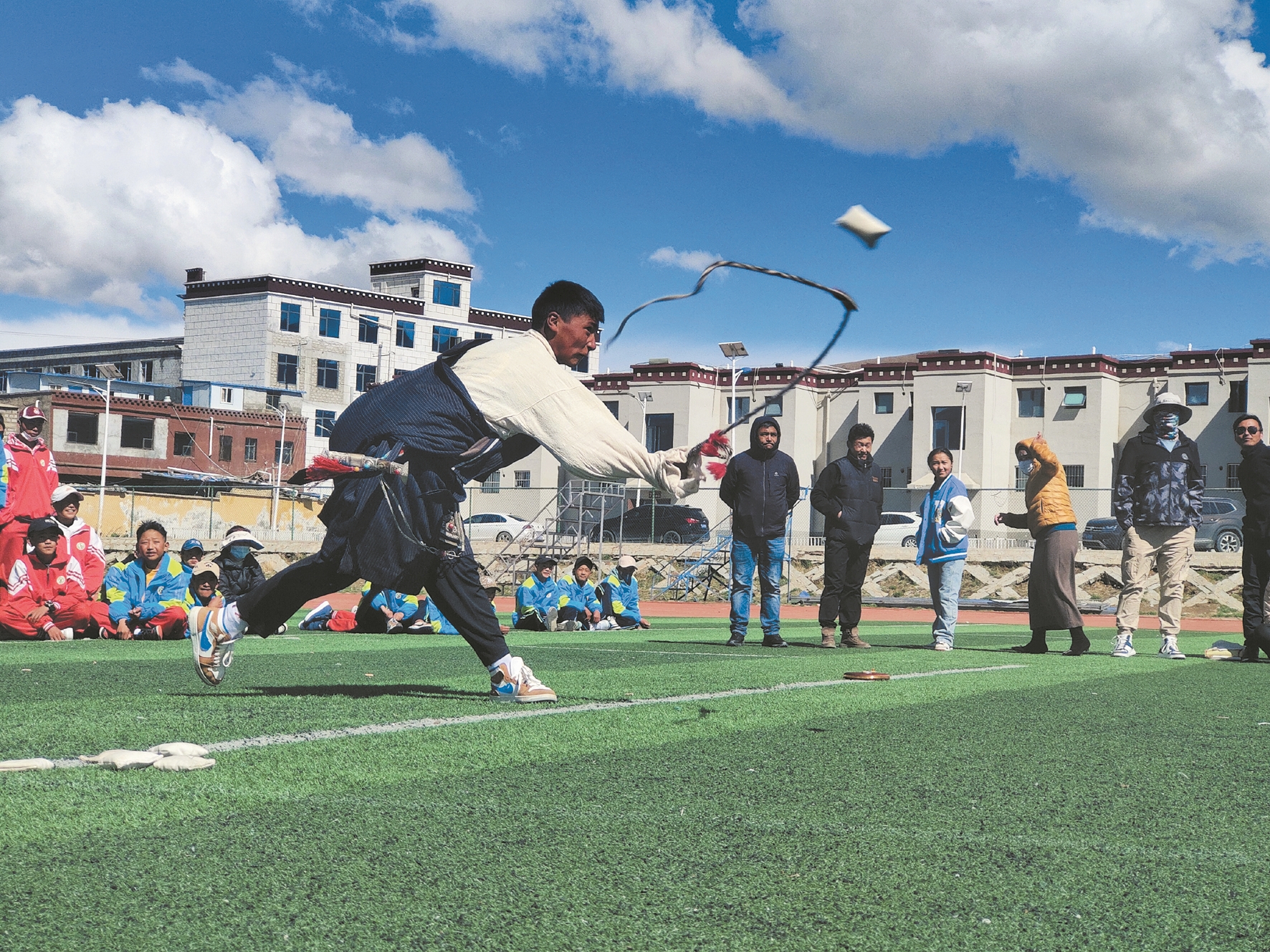 圖為當(dāng)雄縣中小學(xué)生在參加傳統(tǒng)競(jìng)技項(xiàng)目“吾多”比賽。 拉薩融媒記者 白 央攝