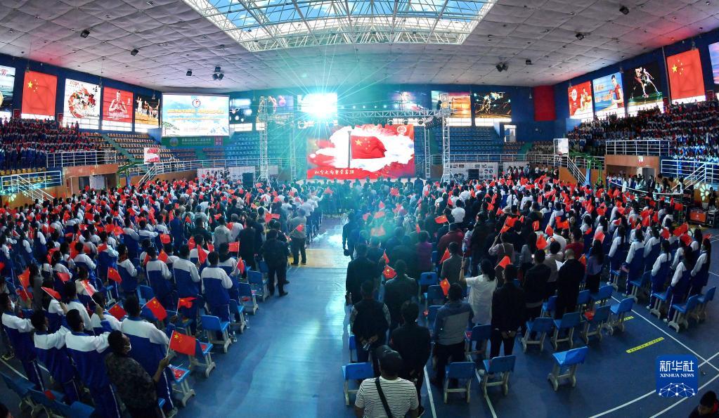 山南市第二高級(jí)中學(xué)學(xué)生在體育館觀看中華詩(shī)文朗誦會(huì)(6月3日攝)。新華社記者 劉洲鵬 攝