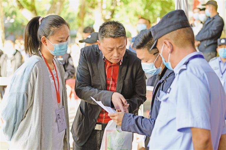 圖為拉薩中學(xué)考點門前,民警正在為考生家長提供幫助。記者 唐斌 攝