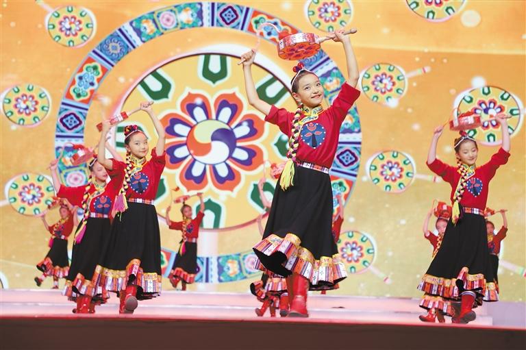 圖為拉薩市實(shí)驗(yàn)小學(xué)的學(xué)生表演《格?;ㄩ_向未來(lái)》文藝節(jié)目。記者 格桑倫珠 攝