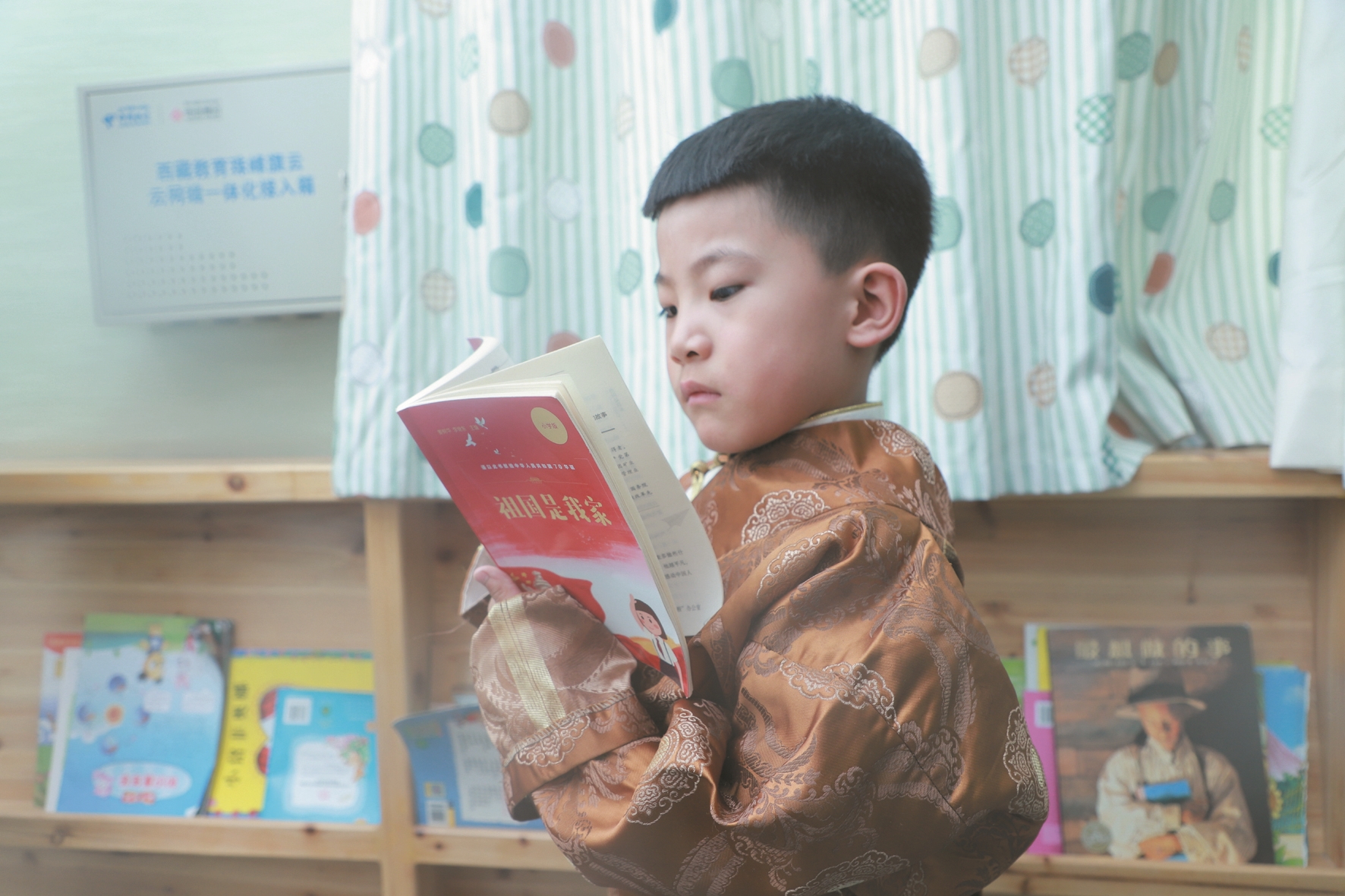 圖書館里,來自拉薩市江蘇實驗幼兒園大五班的小朋友益西加措仔細地挑選著自己喜歡的書籍,只見他饒有興致地選中這本《祖國是我家》,并發(fā)現(xiàn)了書中“我在南京,我為中華之崛起而讀書”的卡片時,他回應道:“我在西藏,我為中華之崛起而讀書。”