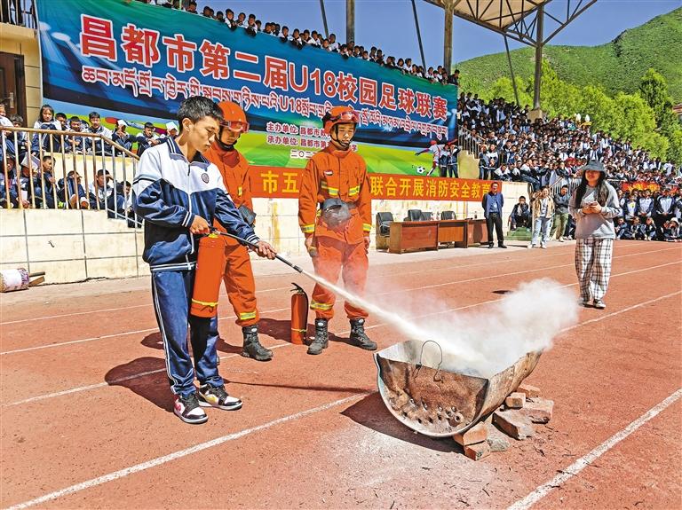 圖為在消防員的指導下,學生體驗滅火。記者 桑鄧旺姆 通訊員 鄧珠平措 攝