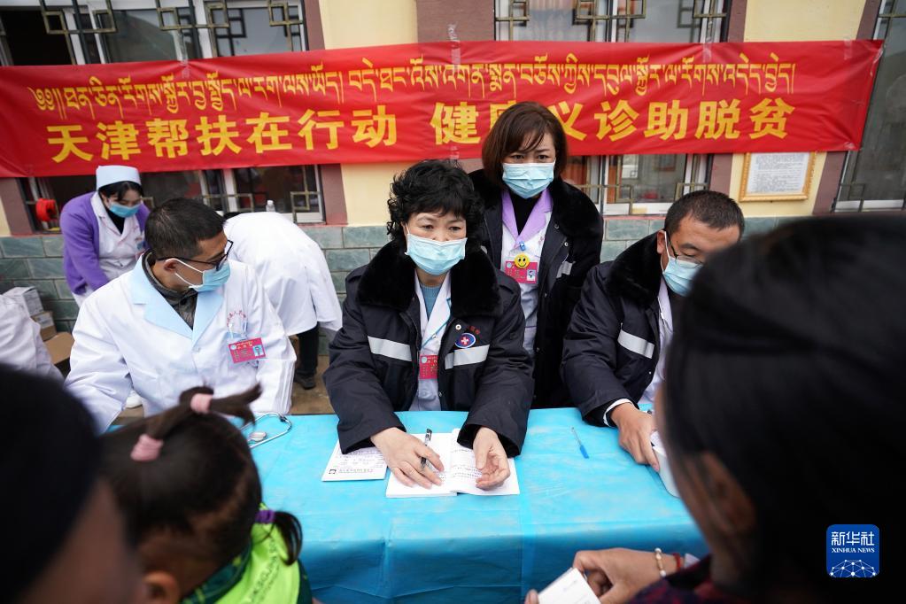 在西藏昌都市江達(dá)縣卡貢村,天津援藏醫(yī)生王佩華(中)為村民義診(2020年9月26日攝)。新華社記者 詹彥 攝