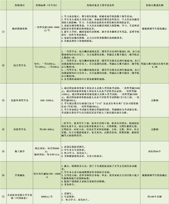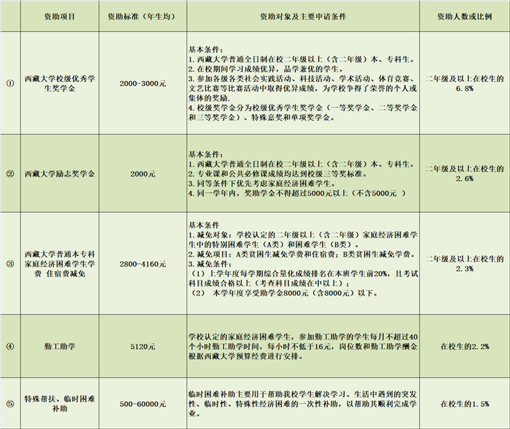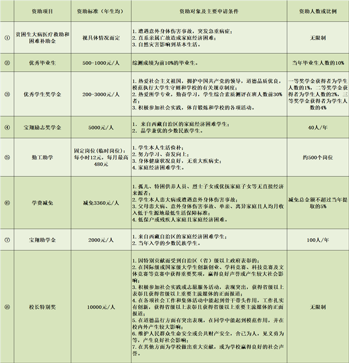 這些資助項(xiàng)目包括國(guó)家政策、西藏自治區(qū)政策和西藏各高校的政策,全部列出了明確的申請(qǐng)條件,涵蓋了學(xué)生生活、學(xué)習(xí)的方方面面。其中,有的項(xiàng)目針對(duì)家庭經(jīng)濟(jì)困難的學(xué)生給予學(xué)費(fèi)、住宿費(fèi)等的減免;有的項(xiàng)目為學(xué)生提供各種校內(nèi)勤工助學(xué)機(jī)會(huì),讓學(xué)生通過(guò)勞動(dòng)獲得報(bào)酬;有的項(xiàng)目獎(jiǎng)勵(lì)入伍,有的項(xiàng)目獎(jiǎng)勵(lì)發(fā)明創(chuàng)造……并且,西藏各高校在制定資助政策時(shí)體現(xiàn)出了各學(xué)校鮮明的辦學(xué)特點(diǎn)。例如,西藏藏醫(yī)藥大學(xué)設(shè)置了面向所有學(xué)生的“記誦《三部醫(yī)典》獎(jiǎng)”,要求“熱愛(ài)社會(huì)主義祖國(guó),擁護(hù)中國(guó)共產(chǎn)黨的領(lǐng)導(dǎo);遵紀(jì)守法,遵守學(xué)校規(guī)章制度;背誦學(xué)生按‘三部醫(yī)典’章節(jié)順序依次背誦。在背誦過(guò)程中,要吐字清晰,聲音宏亮,總時(shí)間不能超過(guò)2個(gè)小時(shí)?!狈彩沁_(dá)到要求的學(xué)生,獎(jiǎng)勵(lì)1800元。