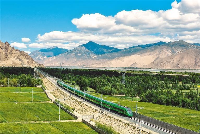 中央支持西藏自治區(qū)基本建成涵蓋公路、鐵路、航空、管道等多種運(yùn)輸方式的綜合立體交通網(wǎng)絡(luò)。2021年6月25日,川藏鐵路拉林段正式開通運(yùn)營(yíng)。圖為開通當(dāng)日,復(fù)興號(hào)高原內(nèi)電雙源動(dòng)車組首次開上青藏高原。