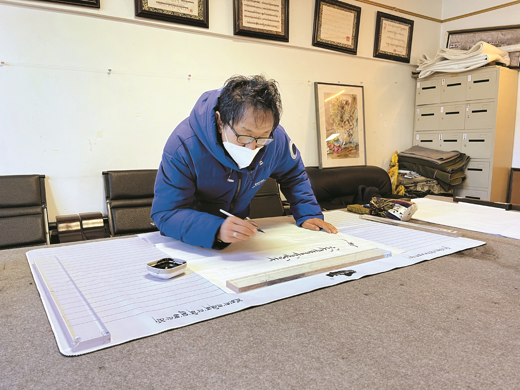 “熱烈慶祝黨的二十大勝利召開”“不忘初心 牢記使命”“人民就是江山 江山就是人民”……走進(jìn)市文聯(lián),映入眼簾的是一幅幅藏文書法作品,書法家匠心獨(dú)運(yùn)、潑墨揮毫,以黨的二十大報(bào)告中的引典金句為主要內(nèi)容,行筆于珠擦、白粗、丘三種字體之間。40幅作品情凝筆端,內(nèi)涵豐富,或渾厚勁健,或靈動(dòng)飄逸,生動(dòng)展現(xiàn)黨的光輝歷程。每幅藏文書法作品下方都附有對應(yīng)的漢語原文,讓參觀者能對黨的二十大報(bào)告原原本本學(xué)、逐字逐句學(xué)、深入系統(tǒng)學(xué)、融會(huì)貫通學(xué)。