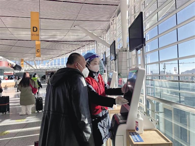 志愿者在自助值機區(qū)域協(xié)助旅客辦理手續(xù)。圖由民航西藏管理局提供