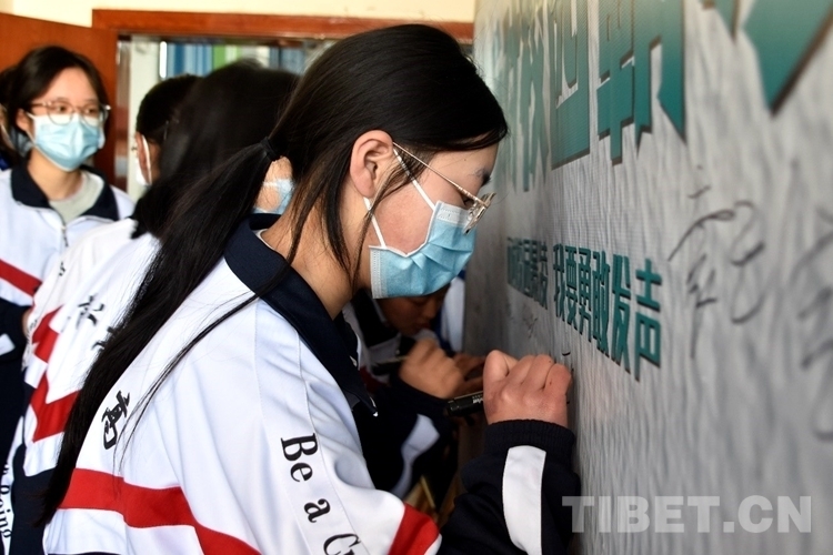 圖為學生們依次在面對校園霸凌我要勇敢發(fā)聲簽名墻進行簽名 攝影:次旦拉姆