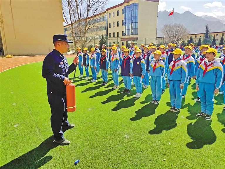 拉薩市森林消防大隊(duì)隊(duì)員在為學(xué)生講解如何使用滅火器。記者 格桑倫珠 盧文靜 攝