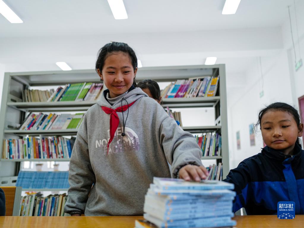 3月31日,下察隅鎮(zhèn)中心小學(xué)的學(xué)生正在把書放回書架。新華社記者 格桑朗杰 攝