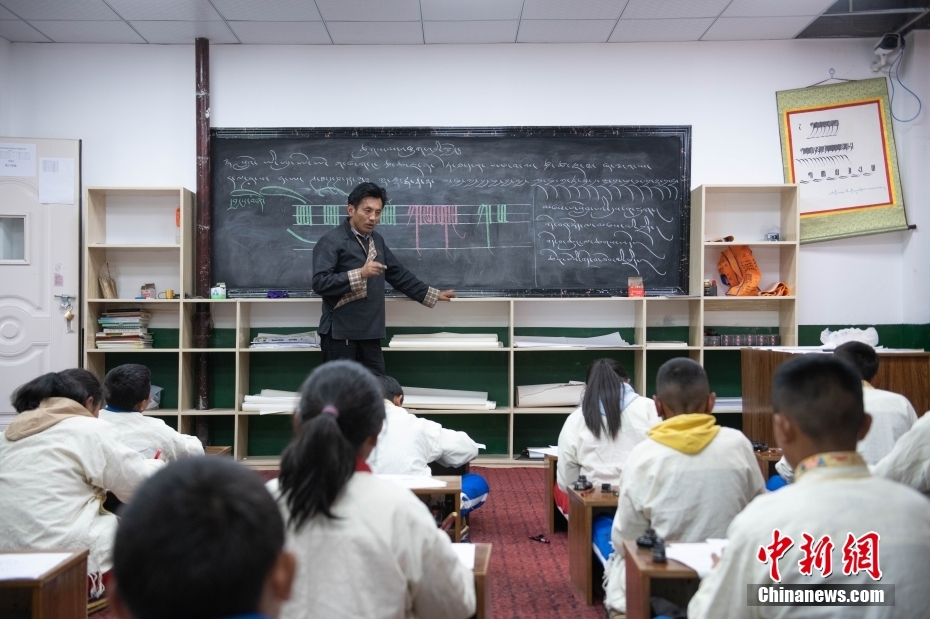 5月7日,西藏山南市,加查縣中學(xué)藏文書法興趣班的教師扎西達(dá)瓦給學(xué)生們上課。該興趣班由2名藏文教師任教,每周兩課時(shí),利用自習(xí)課或晚自習(xí)時(shí)間為學(xué)生和教師授課。課程內(nèi)容包含執(zhí)筆、運(yùn)筆、姿勢等基礎(chǔ)書寫技能,以及藏文中的烏金體、珠擦體、簇仁體、簇通體等各類字體的書寫方法。