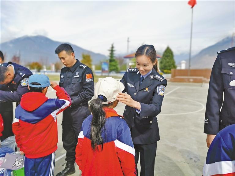 圖為羌納邊境派出所民警為結(jié)對幫扶的同學發(fā)放學習生活用品。記者 張猛 王珊 謝筱純 攝