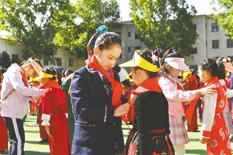 拉薩市第三小學少先隊老隊員為新入隊隊員系紅領巾。記者 次仁平措 攝