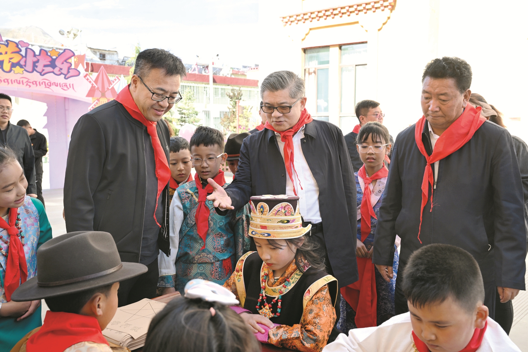 拉薩市第一小學是西藏和平解放后拉薩開辦的第一所公立小學,建校70年來,為新西藏各項建設(shè)事業(yè)輸送了萬千棟梁人才。來到拉薩市第一小學江蘇路分校,身著民族服飾的藏族小姑娘南杰拉措為王強一行系上鮮艷的紅領(lǐng)巾,并熱情帶領(lǐng)王強一行走向校園。