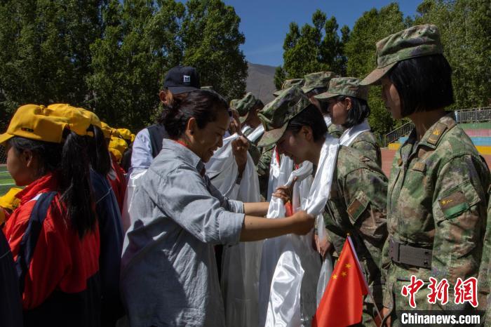 圖為該小學(xué)老師為女兵獻上哈達表示感謝。 朱政 攝