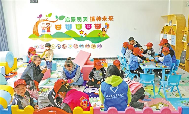 圖為志愿者陪伴瓊結縣加麻鄉(xiāng)昌嘎村兒童在該村日間照料中心婦幼兒童功能區(qū)玩耍。記者 劉楓 通訊員 熊起樊 攝