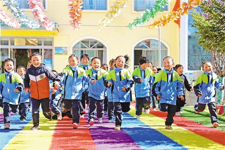 山南市瓊結縣雙語幼兒園兒童在園內嬉戲。