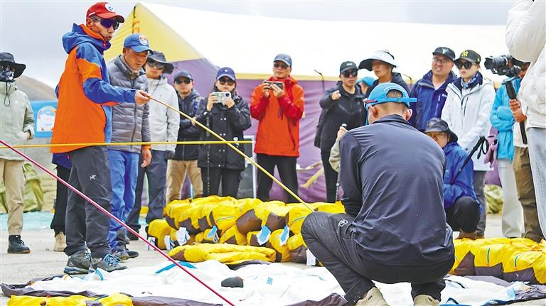 圖為西藏自治區(qū)登山隊(duì)工作人員在搭建帳篷。記者 鄭璐 袁海霞 攝