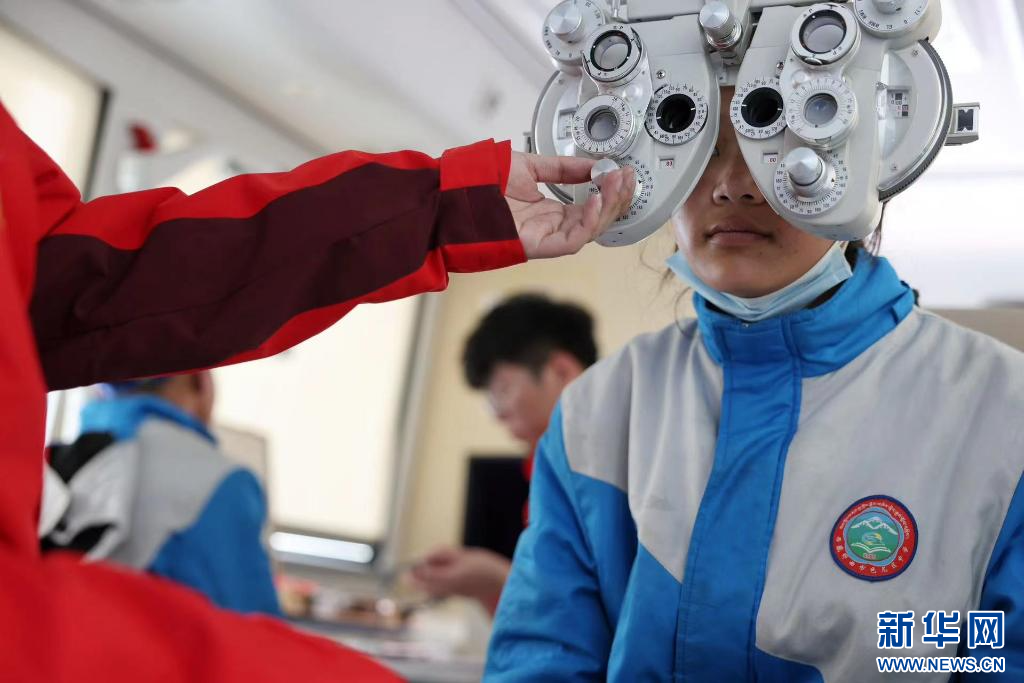 ??在西藏自治區(qū)那曲市色尼區(qū)第二中學(杭嘉中學),志愿者用綜合驗光儀為學生驗光(6月22日攝)。新華社發(fā)(趙穎碩 攝)
