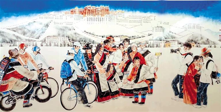 隨著一系列支持政策的持續(xù)推進(jìn)和西藏各族兒女的團(tuán)結(jié)奮斗,西藏的經(jīng)濟(jì)發(fā)展和民生水平都得到了大幅度提升。同時,關(guān)注西藏發(fā)展現(xiàn)實、進(jìn)行美術(shù)創(chuàng)作的藝術(shù)家日漸增多,一件件優(yōu)秀美術(shù)作品應(yīng)運而生,并且在全國重要展覽中精彩呈現(xiàn),向人們?nèi)妗⒘Ⅲw地展現(xiàn)了新時代西藏人民生活的美好圖景。2022年秋季在中國美術(shù)館展出的“第13屆中國藝術(shù)節(jié):全國優(yōu)秀美術(shù)作品展覽”中,有大量表現(xiàn)西藏民族風(fēng)情和民生發(fā)展題材的美術(shù)作品,從作品構(gòu)思到藝術(shù)表現(xiàn),體現(xiàn)出鮮明的民族文化特色和民生繁榮景象,展現(xiàn)出美術(shù)創(chuàng)作者深植心底的鑄牢中華民族共同體意識創(chuàng)作理念。