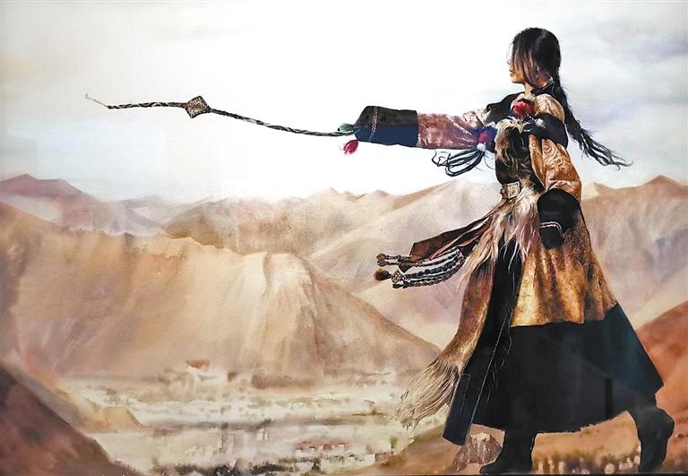 中國畫作品《幸福西藏》運用工筆重彩的繪畫藝術(shù)表現(xiàn)形式,描繪了布達(dá)拉宮廣場上民族和睦的美好生活圖景。畫面中,湛藍(lán)天空下,藏族群眾與遠(yuǎn)道而來的各地游客們相聚雪域高原,燦爛的笑容映照出新時代西藏人民的美好生活,也反映出西藏自然風(fēng)光、人文風(fēng)情對各地游客的極大吸引力。從青年旅行者們或騎著單車,或舉起相機(jī)認(rèn)真拍照的表情,能深刻感受到他們對美麗西藏的向往。同時,繪畫作品反映出近年來西藏旅游事業(yè)的蓬勃發(fā)展以及各族兒女團(tuán)結(jié)互助、攜手進(jìn)步的新時代美好生活景象。水彩·粉畫《颯·薩》運用人物特寫的藝術(shù)創(chuàng)作手法,展現(xiàn)出一位西藏姑娘甩出烏爾朵的颯爽姿態(tài);油畫《藏歷新年薩迦禳祈?!芬悦骺鞜崃业纳屎嫱谐霎?dāng)?shù)孛癖娺M(jìn)行藏歷新年祈?;顒拥臍g樂場景;油畫《中國玉麥》以紀(jì)實敘事的創(chuàng)作方式,描繪了隆子縣玉麥鄉(xiāng)卓嘎、央宗姐妹放牧守邊的故事,畫面中她們專注地懸掛國旗的樸實舉動,傳遞出高原姊妹對祖國的深愛之情。