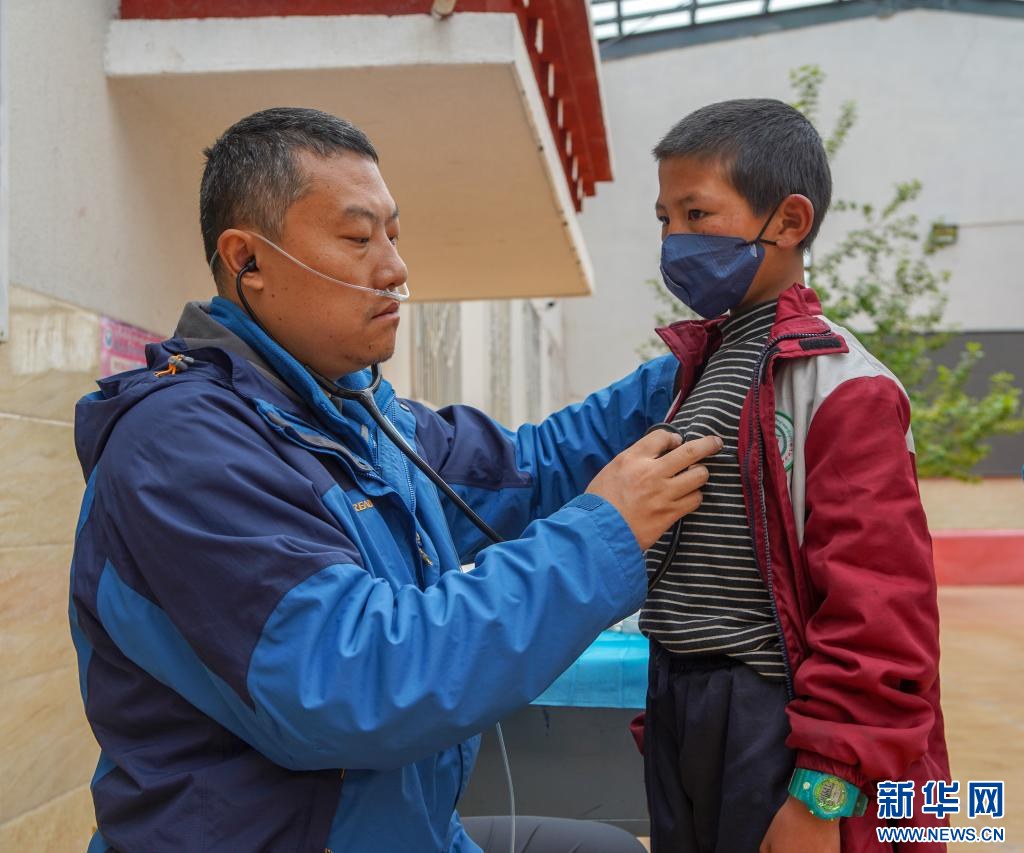 7月4日,耿直醫(yī)生在給那曲市色尼區(qū)尼瑪鄉(xiāng)小學(xué)學(xué)生做心臟聽診。(新華社記者 邵澤東 攝)