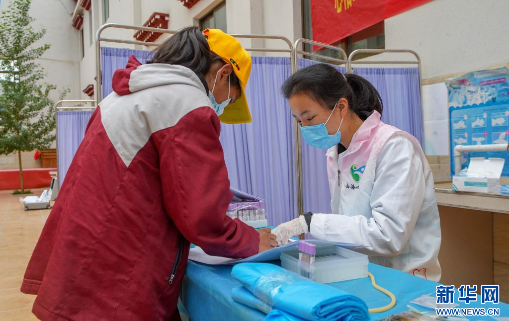 7月4日,那曲市色尼區(qū)尼瑪鄉(xiāng)小學(xué)學(xué)生排隊等待做心臟聽診。(新華社記者 邵澤東 攝)