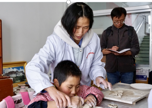 圖為陶藝室內(nèi),陳雙燕和學生在捏泥巴。