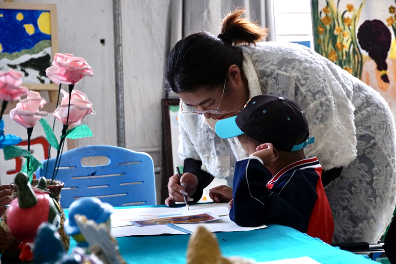 圖為培智美工教室內(nèi),在特教老師輔導下繪畫的學生。