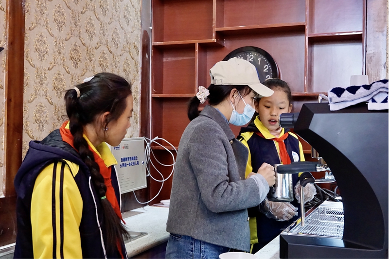 13歲的拉巴卓瑪和15歲的益西措姆正是體驗職教班咖啡課的學生,她們相較于其他學生擁有更強的專注力和動手能力,一天便能熟練操作咖啡機。在帶教老師次旦卓嘎看來,“她們雖然是學困生,但其實看上去和普通小孩沒有什么不同?!?/p>