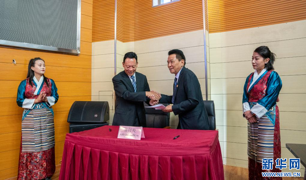 西藏藏醫(yī)藥大學與西藏自治區(qū)藏醫(yī)院全方位戰(zhàn)略合作簽約儀式現(xiàn)場(9月28日攝)。新華社發(fā)(丁增尼達攝)