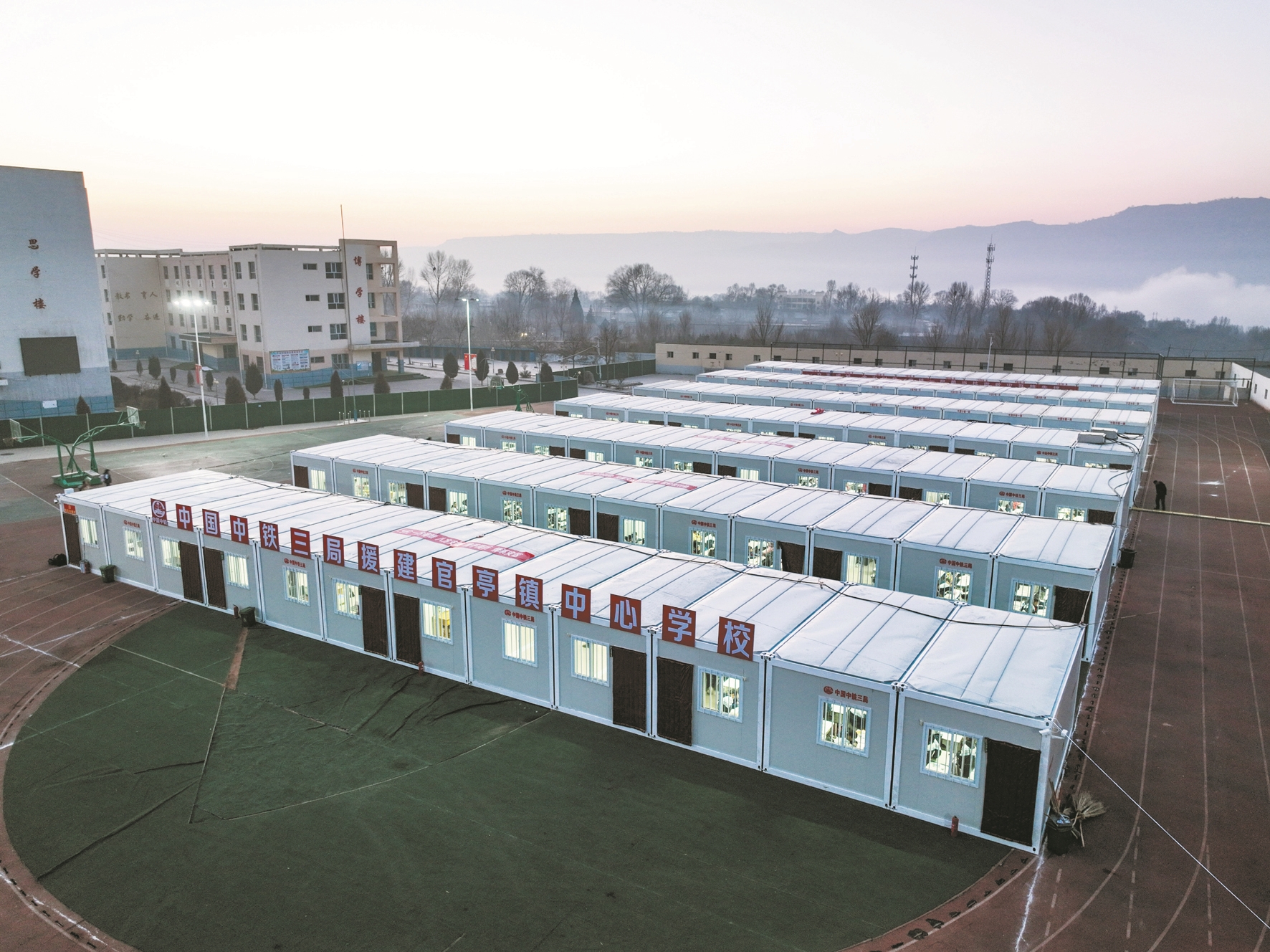 這是1月2日在青海省海東市民和回族土族自治縣官亭鎮(zhèn)中心學(xué)校拍攝的板房教室(無人機照片)。(新華社發(fā))