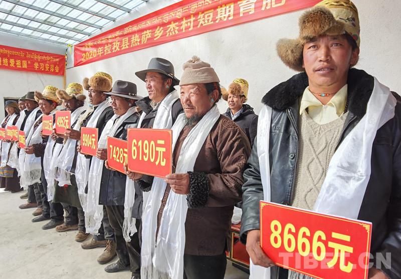 資料圖:圖為西藏日喀則市拉孜縣熱薩鄉(xiāng)杰村參與短期育肥農(nóng)民專業(yè)合作社的村民們領(lǐng)到了分紅款