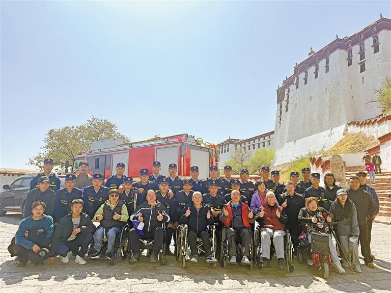 “圓夢(mèng)”之旅結(jié)束后,殘障游客與消防指戰(zhàn)員在布達(dá)拉宮腳下合影。