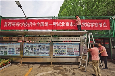 6月6日,記者在北京航空航天大學(xué)實(shí)驗(yàn)學(xué)校中學(xué)部(簡(jiǎn)稱“北航實(shí)驗(yàn)學(xué)?!保┛键c(diǎn)看到,學(xué)校西門處已懸掛起高考考點(diǎn)橫幅、考場(chǎng)布置已就位,校園內(nèi)放置了多個(gè)溫馨的提示語(yǔ)標(biāo)牌。據(jù)悉,該校是今年新增高考考點(diǎn)之一,承接來(lái)自9所學(xué)校277名考生的高考組考任務(wù)。此外,記者還探訪了北京高考人大附中經(jīng)開(kāi)學(xué)??键c(diǎn)