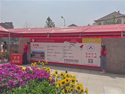 “2024高考加油”“高考就是高高興興地考試”“保持靜心,增強(qiáng)信心,做題專心,考試細(xì)心”……考生一進(jìn)考點(diǎn),就可以看到這些鼓舞人心的標(biāo)語(yǔ)。走出考點(diǎn)時(shí),一張巨型“圓夢(mèng)號(hào)”頭等艙登機(jī)牌映入學(xué)生眼簾,祝福考生們展翅高飛,前程似錦。