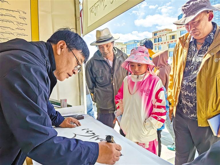 在那曲市團(tuán)結(jié)廣場,群眾感受藏文書法魅力。記者 趙書彬 攝