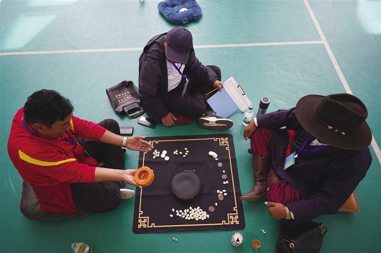 當(dāng)日,“吉韌”“秀茲”等項目一同開賽。 “吉韌”也叫藏式克郎球,是藏族的一種彈指運(yùn)動。比賽在一張邊長約1米的正方形木桌球臺上進(jìn)行,球臺四角有4個小洞,黑、白兩種扁圓形球子各9個,另有1個紅色球子放置在球臺中心,1個白色母球供雙方彈擊球子所用。