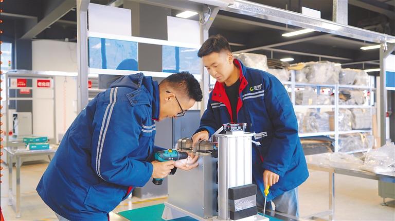 在西藏清匠電器科技有限公司生產(chǎn)車間,來自多頗章鄉(xiāng)嘎東團結(jié)新村六組村民朗嘎崔成正和與他一同入職的員工學(xué)習(xí)安裝制氧機。2023年大學(xué)畢業(yè)以來,朗嘎崔成一直待業(yè),偶爾打零工補貼家用,今年3月,嘎東團結(jié)新村就業(yè)服務(wù)站為他爭取了這個就業(yè)崗位。