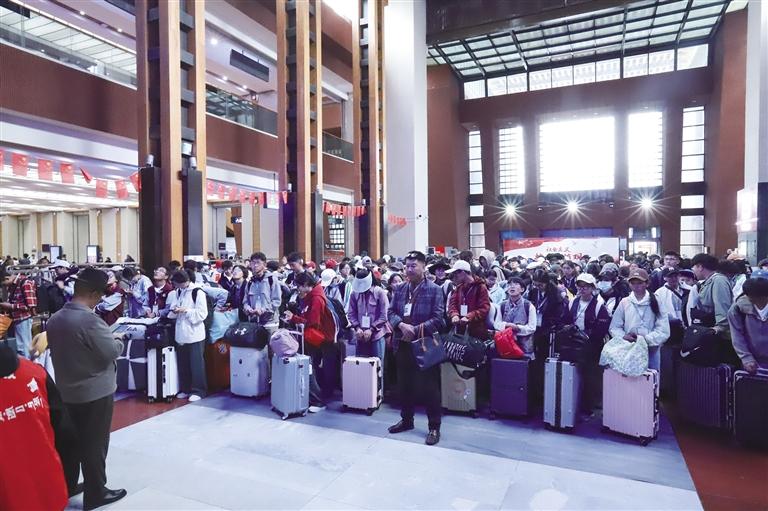 拉薩火車站工作人員組織學(xué)生團(tuán)體準(zhǔn)備進(jìn)站。圖由孫皓提供