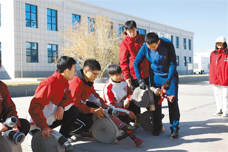 消防指戰(zhàn)員向青年志愿者講解水帶水槍的連接使用。 通訊員 土旦穆朗 攝