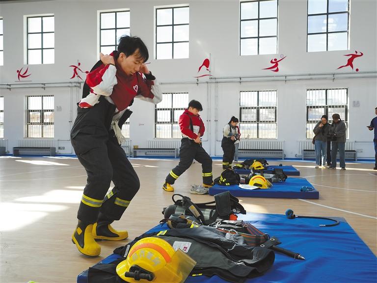 青年志愿者體驗(yàn)原地穿著滅火救援服。 通訊員 土旦穆朗 攝