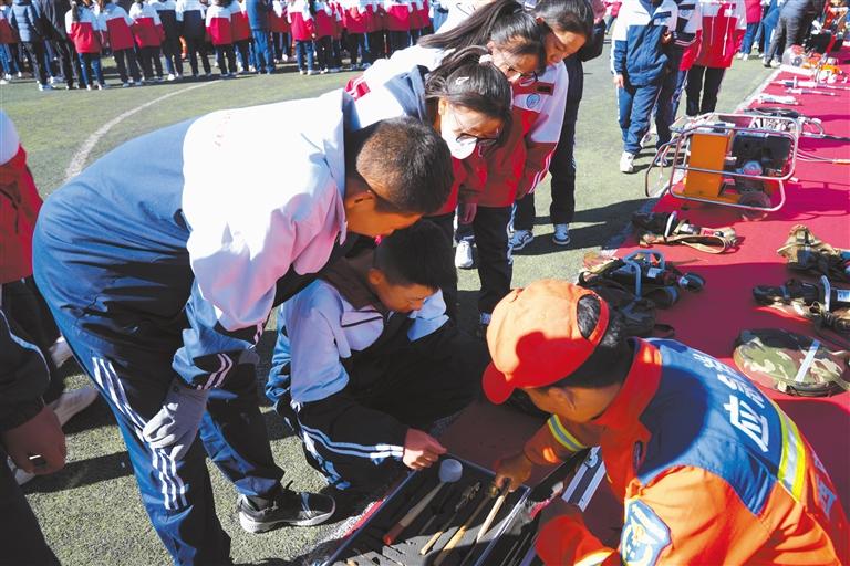 消防員為學生示范滅火器使用方法。記者 旦增嘎瓦 攝