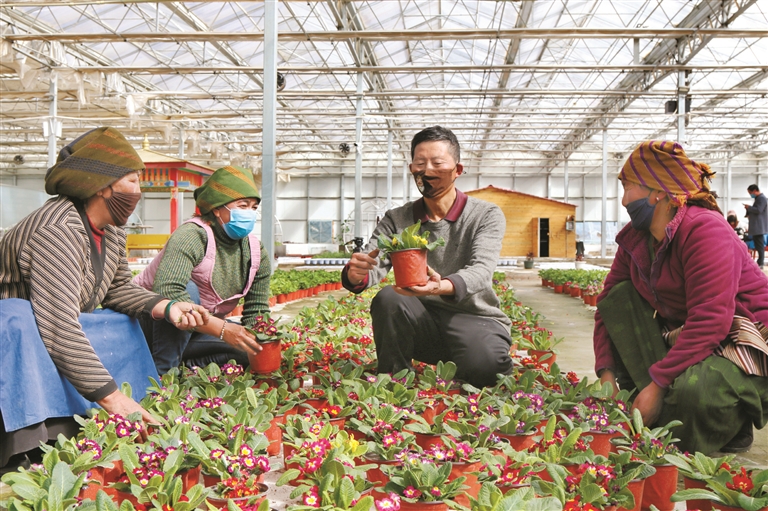 在鄉(xiāng)村振興建設(shè)中,林周縣走出了自己的特色致富路,優(yōu)秀產(chǎn)業(yè)項(xiàng)目遍地開(kāi)花。圖為技術(shù)員為群眾講解花卉種植知識(shí)。 拉薩融媒記者 龍俊霖?cái)z