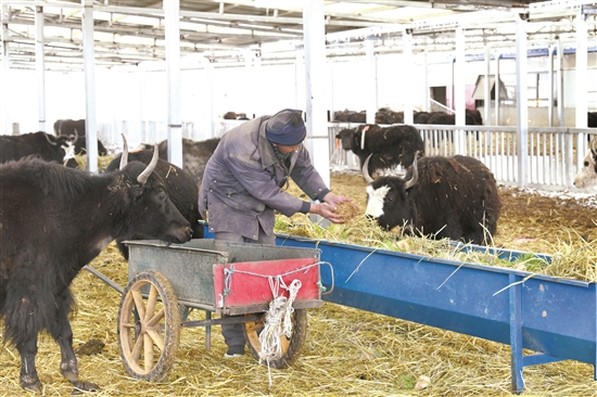 為當(dāng)雄縣凈土牧場(chǎng)郭慶廠員工正在給牦牛喂飼料。
