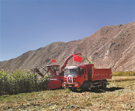 在曲水縣達(dá)嘎鎮(zhèn)色達(dá)村,西藏農(nóng)投集團(tuán)飼料種植基地青貯玉米迎來(lái)豐收。圖為收割機(jī)正在收割青貯玉米。拉薩融媒記者 王 雪攝